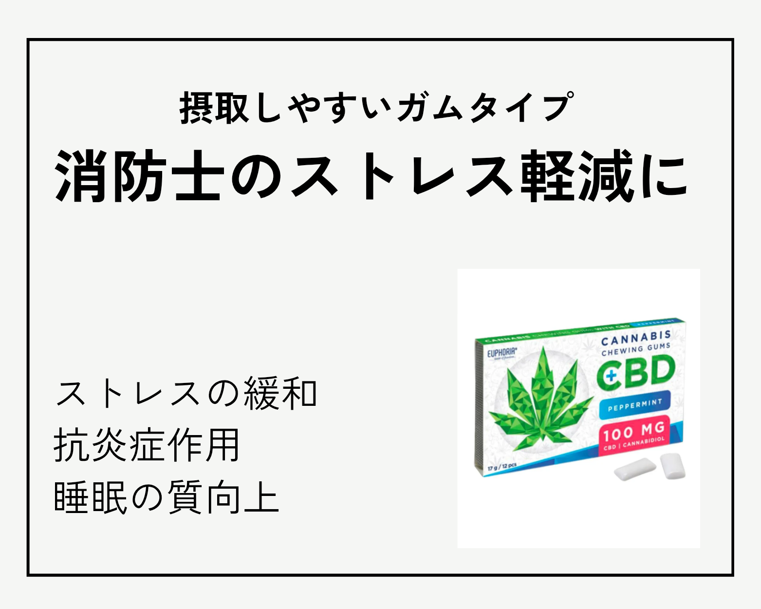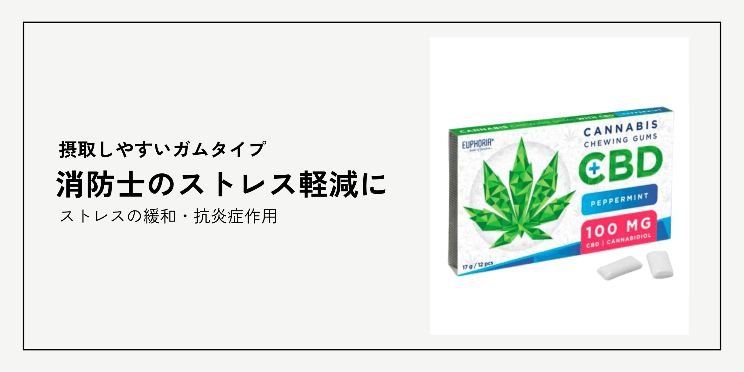 当商品は、ヘンプ(大麻・麻)由来の健康成分「CBD(カンナビジオール)」を12個で100mg配合した、ガムタイプのCBDです。